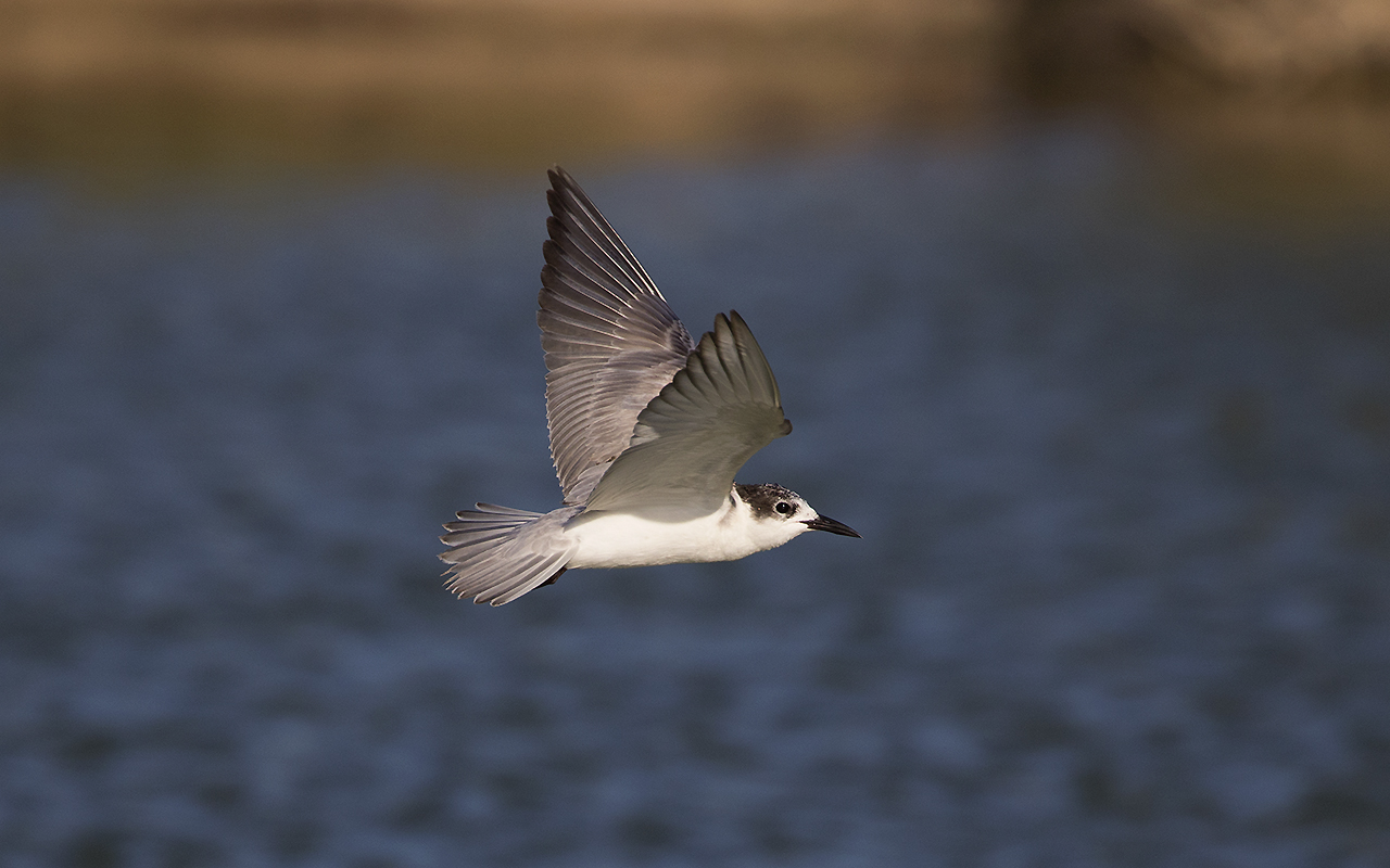 | A single Whiskered Tern hawks for insects over the tiny bore |